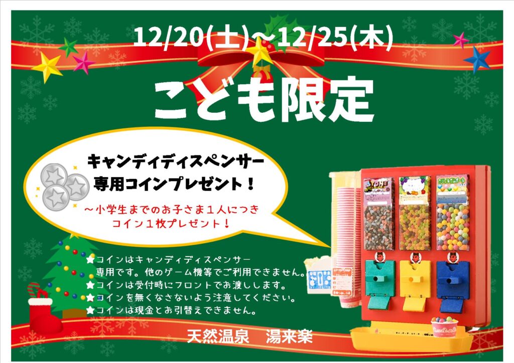 こども限定Xmasイベント 12/20~25までおこさま限定でキャンディガチャコインを1枚プレゼント。 ささやかながら湯来楽からのクリスマスです。 ご家族でぜひお越しください。 2025年12月19日 15:48