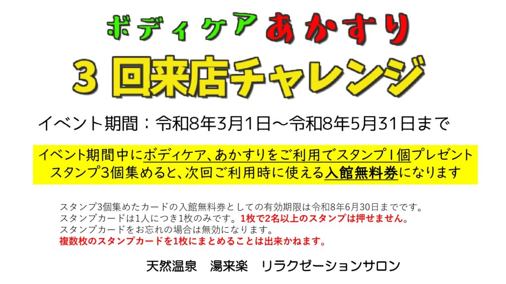 アカスリ、ボディケアそれぞれ期間中3回利用すると入館無料に!